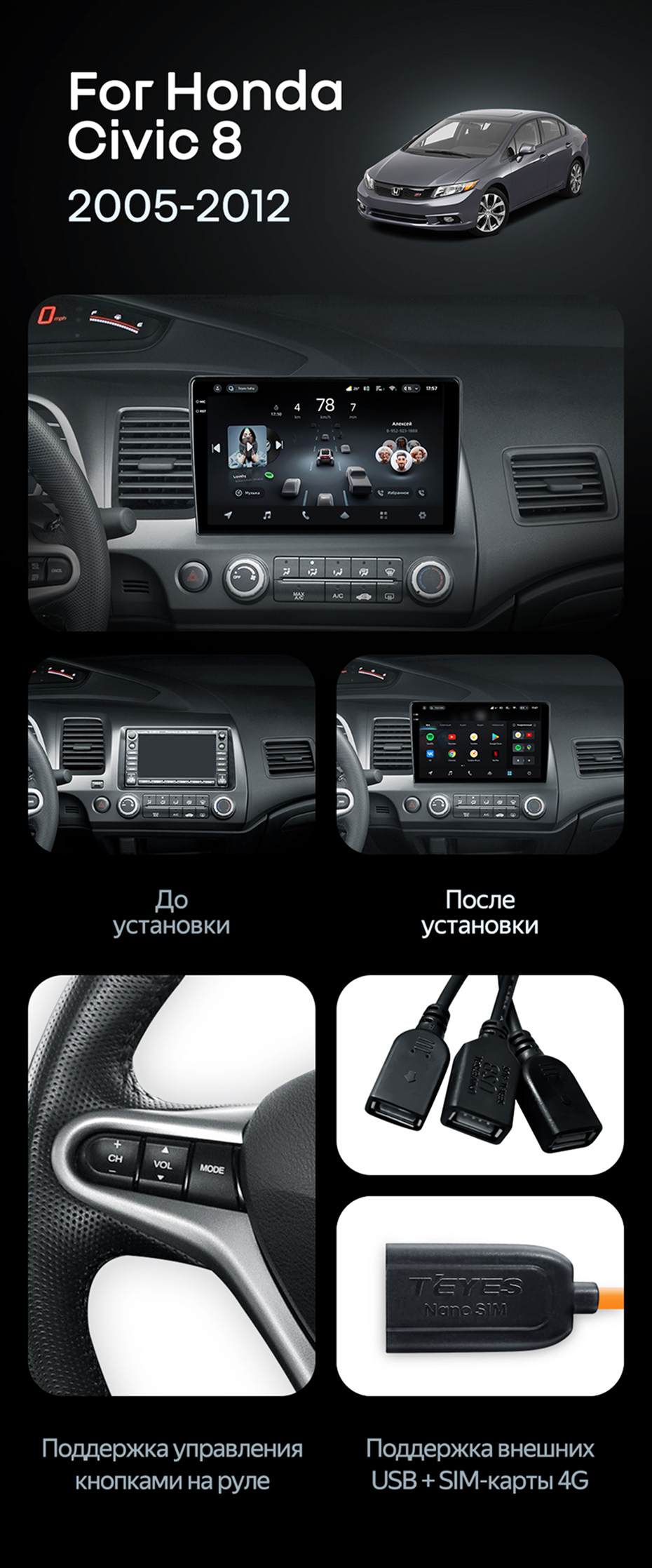Штатная магнитола Teyes CC4 Pro 12/256 Honda Civic 8 FK FN FD (2005-2012) - купить всего за 67 750 руб. в интернет-магазине в Набережных Челнах Teyes.com.ru. ✓ Самый лучший выбор мультимедиа ✓ Лучшая замена штатному ГУ ✓ Тел. +7 (800) 775-31-74