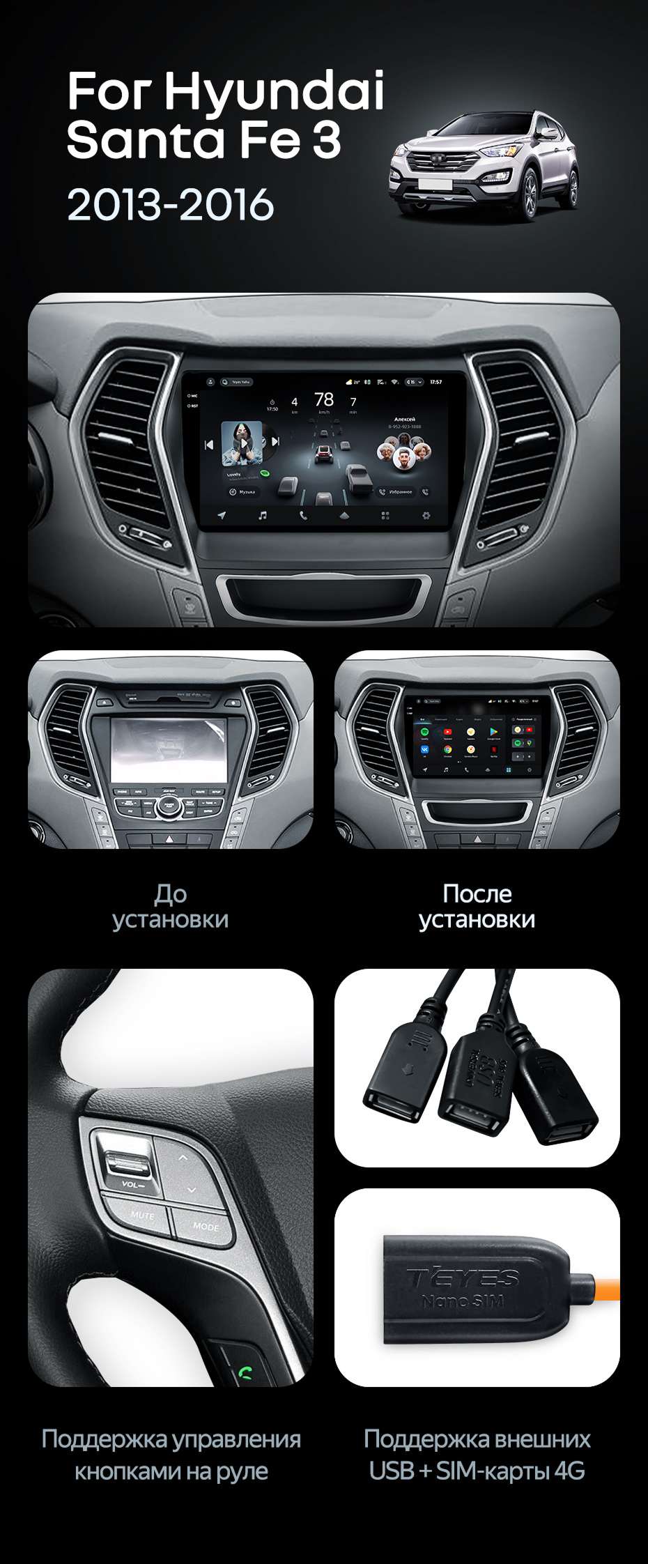 Штатная магнитола Teyes CC4 Pro 12/256 Hyundai Santa Fe 3 (2013-2016) Тип-C - купить всего за 68 640 руб. в интернет-магазине в Набережных Челнах Teyes.com.ru. ✓ Самый лучший выбор мультимедиа ✓ Лучшая замена штатному ГУ ✓ Тел. +7 (800) 775-31-74
