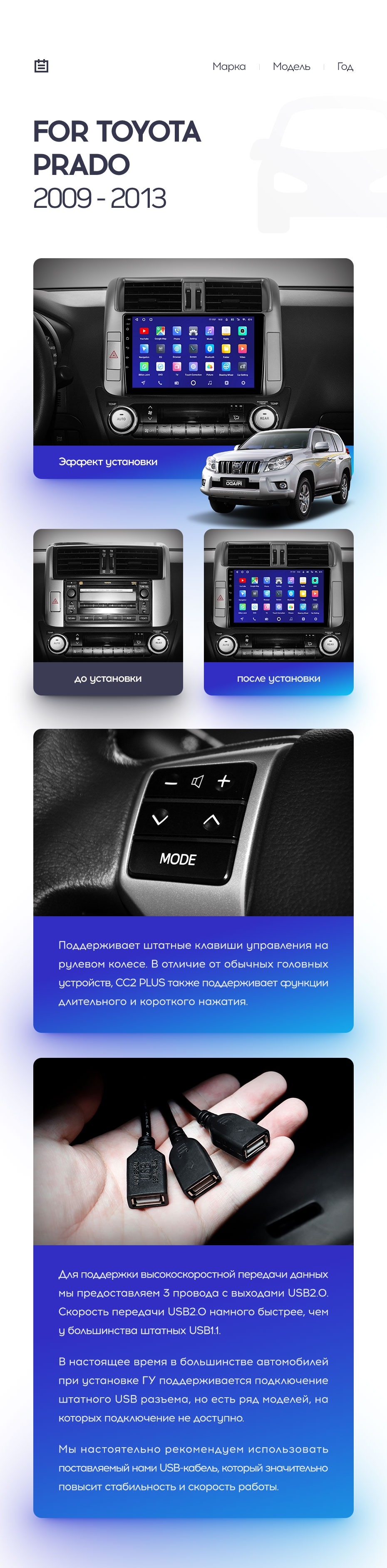 Полный комплект установки магнитолы Teyes с рамкой и проводкой можно выбрать в каталоге штатных магнитол Toyota Land Cruiser Prado 150 (2009-2013).