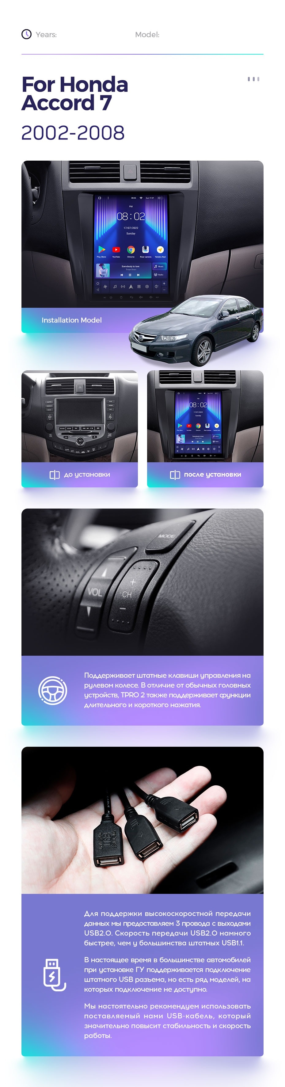 Полный комплект установки магнитолы Teyes с рамкой и проводкой можно выбрать в каталоге штатных магнитол Honda Accord 7 CM UC CL (2002-2008).